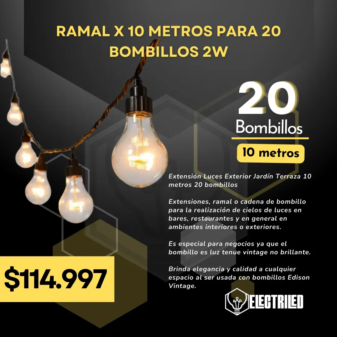 Extensiones, ramal o cadena de bombillo para la realización de cielos de luces en bares, restaurantes y en general en ambientes interiores o exteriores.